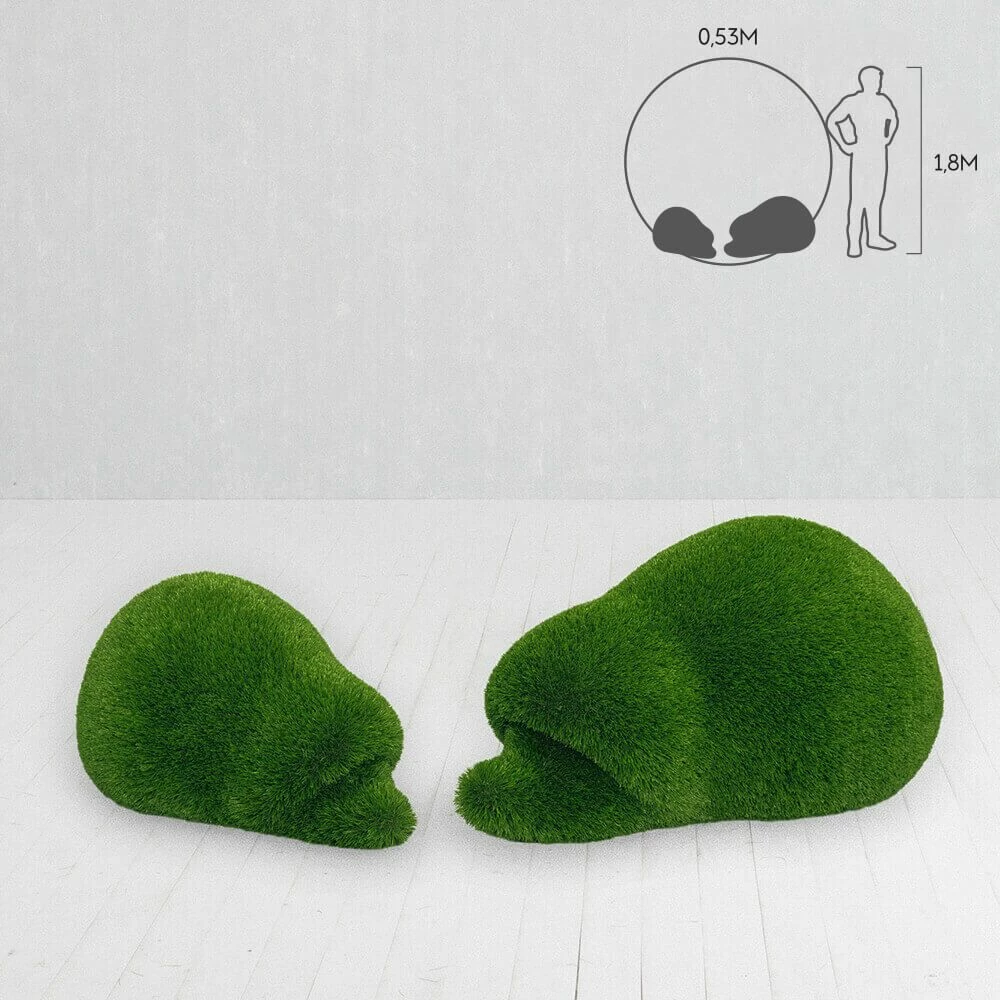 Alle Figuren entstehen als 3D-Modell am Computer. Anschließend wird der Rahmen aus Glasfaserkunststoff hergestellt und von Hand mit Kunstrasen beklebt. Jede Skulptur ist somit ein individuelles Unikat. Dank des Glasfaser Rahmens sind die Topiaries besonders leicht, stoßfest und langlebig – außerdem rostfrei, korrosions- sowie temperatur- und UV-beständig. Es sind keine weiteren Pflegemaßnahmen nötig. Die Gewichtsbeschränkung für die Formschnittfiguren liegt zwischen 30 bis 250kg. Wichtig ist, dass die Skulpturen weit entfernt von Feuerstellen aufgestellt werden.