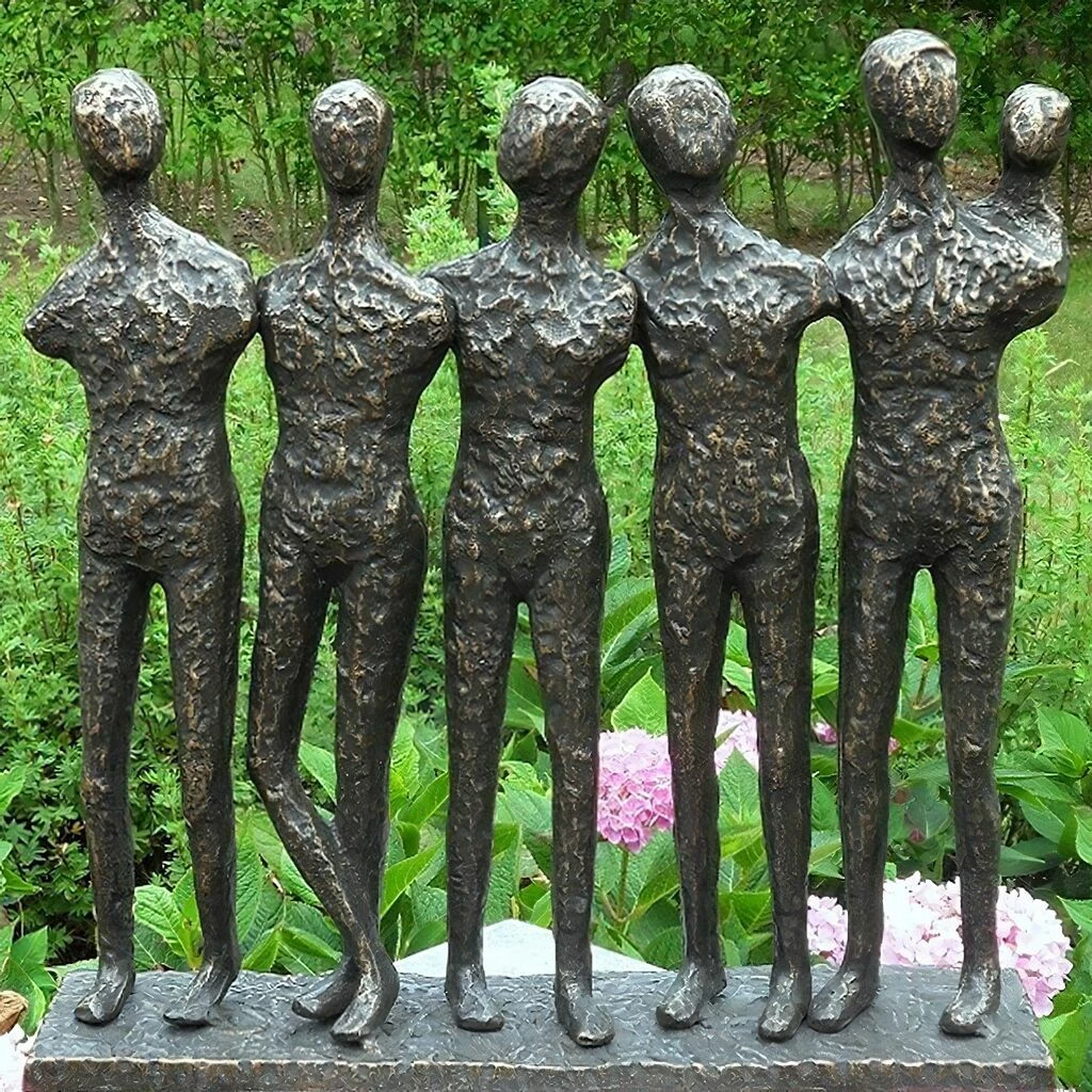 Die Skulptur einer Menschenreihe ist im stilistischen Design gegossen und erhält handwerkliche Akzente in der Oberflächengestaltung. Egal ob Nässe, Hitze oder Frost, diese Bronzestatue ist beständig gegenüber Witterung.