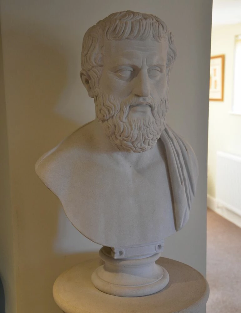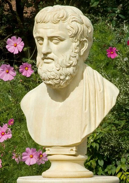 Eindrucksvolle Gartenbüste aus Stein mit einer Darstellung des Aristoteles (384 – 322 v. Chr.). Diese Steinbüste aus unserem exquisiten Sortiment englischer Skulpturen zeigt den berühmten Philosophen Aristoteles, Schüler des Platon, der mit seinen umfangreichen Schriften die abendländische Philosophie prägte wie kein zweiter. Ein wesentlicher Teil der Schriften des Aristoteles beschäftigt sich mit Fragen der Naturphilosophie, den Veränderungsprozessen in der Natur und der Naturelemente. So ist diese Dekobüste nicht nur optisch in besonderer Weise für eine naturnahe Gartengestaltung geeignet. Aus einem kostbaren Kunststein gegossen, bieten wir diese detailliert gestaltete Büste in den attraktiven Farben Sand, Weiß und Terrakotta an. Die Gartenbüste aus Stein wartet mit bester Qualität auf. Der Kopf des Aristoteles ist bin in die kleinsten Details kunstfertig gestaltet. Aristoteles verkörpert als Garten Büste den unbedingten Willen, sich die Welt denkend zu erschließen. Schon als Lehrmeister Alexander des Großen konnte der Philosoph vieler seiner Ideen in die Welt tragen. Für Gartenbesucher ist diese hochwertige Büste daher nicht nur ein stilvolles Gestaltungselement von antiker Schönheit, sondern auch ein tolles Anschauungsobjekt.