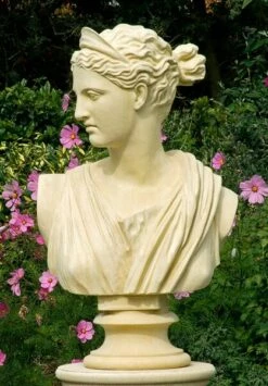Besonders gut kommt diese Gartenbüste aus Stein auf einem antik gestalteten Sockels des gleichen Materials zur Geltung. Ob am Gartentor, im Vorgarten, im Eingangsbereich oder auf der Terrasse – mit dieser Gartenbüste verleihen Sie dem Außenbereich ein ganz besonderes Flair. Die ausgewählten Dekobüsten in unserem Sortiment sind original antike Replikate aus England, die wir exklusiv für unsere Kunden günstig zum Verkauf anbieten. Die Herstellung erfolgt in klassischer Handarbeit durch einen Steinmetz. Zunächst wird für die Steinfigur, Dekoskulptur oder Gartenbüste eine Hohlform gefertigt, in welche eine hochwertige Steinmasse erdfeucht eingeschlagen wird. Durch die Beimengung spezieller Farbpigmente erhält die Büste ihre besondere Farbgebung. So harmonisiert die Büste für den Garten optisch hervorragend mit einer natürlichen Umgebung. Wenn Sie diesen Gartenbüste aus Stein online bei uns im Shop kaufen, liefern wir sie versandkostenfrei direkt zu Ihnen nach Hause.