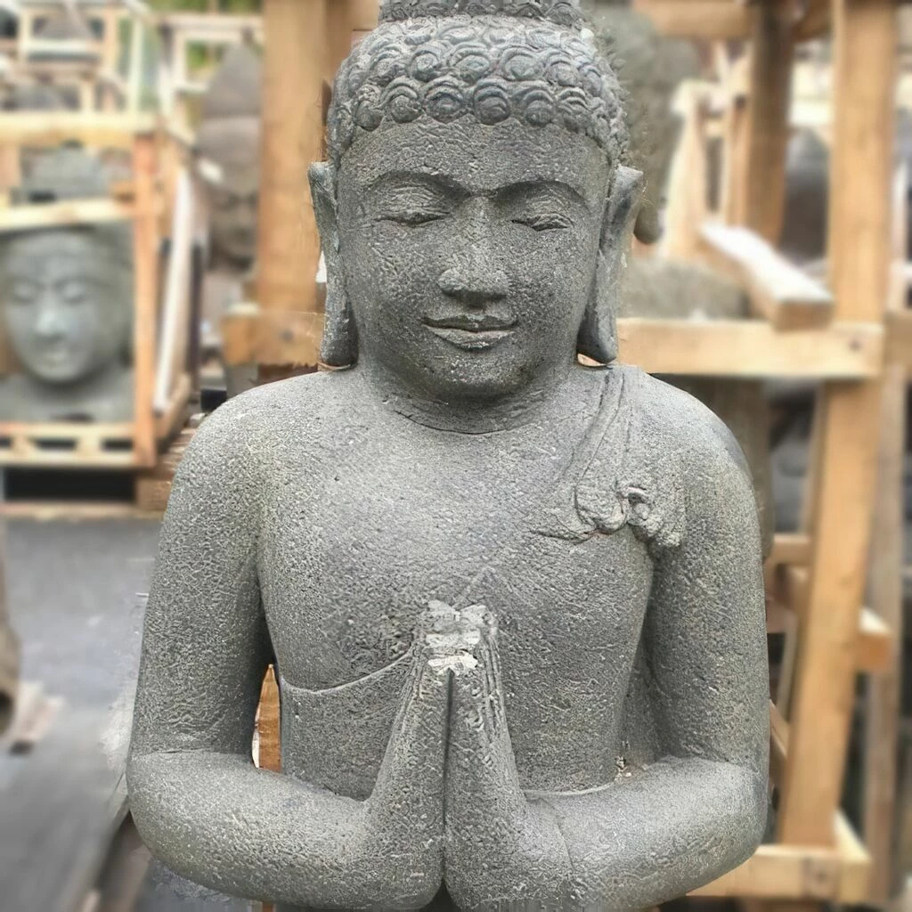 Eine Buddha Statue symbolisiert traditionell Gelassenheit und Frieden. Diese kunstvolle Buddhafigur aus Basanit überträgt diese Eigenschaften wunderbar auf seine Umgebung und bringt eine gute Stimmung in Ihr Heim. Der hier im Lotussitz mit der typischen Handhaltung der Begrüßung dargestellte sitzende Buddha aus Basanit hat eine einladende Wirkung und strahlt Freundlichkeit sowie Sympathie aus. Eine sitzende Buddhaskulptur mahnt, belehrt und erleuchtet. Mit einer Buddha Statue aus Basanit bringen Sie nicht zuletzt ein Stück fernöstlichen Zaubers in Ihr Heim. Diese handgeschlagene Buddhafigur aus Basanit ist ein Unikat des indonesischen Künstlers Mukit, die auch Ihren Garten in die besondere Atmosphäre fernöstlichen Zaubers tauchen wird. Unsere Buddha Statue kann zu jeder Jahreszeit draußen stehen, da sie in hochwertiger Handarbeit gearbeitet und frostfest ist.