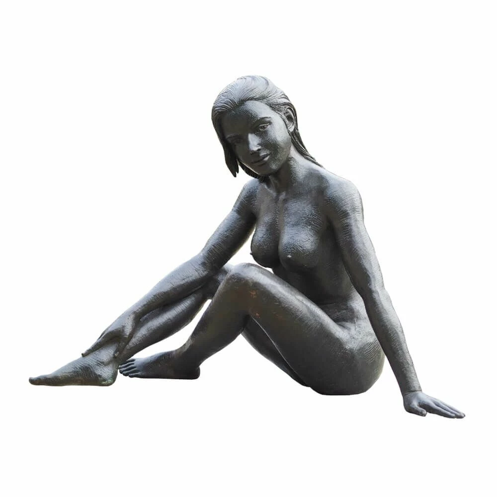 In sitzender Pose wird diese stilvolle Frauenfigur mit einer dunkelbraunen Patina aus Bronze hergestellt. Die Aktstatue kann am Pool, auf der Wiese oder auf der Terrasse auf einem ebenerdigen Untergrund befestigt werden.