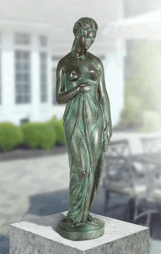 Die Bronze ist extrem robust gegenüber Frost, Nässe sowie Hitze und sehr langlebig. Die Patina wird per Hand aufgetragen und führt aufgrund variierender Farbnuancen zu einer Einzigartigkeit jeder Skulptur. Die Farbe kann somit leicht vom Bild abweichen. Die Reinigung sollte ohne chemische Substanzen erfolgen, um die Schutzschicht nicht zu zerstören und kann einfach mit einem feuchten Tuch erfolgen. Die Gartenstatuen werden für die Befestigung auf einem Sockel mit Bohrungen an der Unterseite ausgestattet. Passende Gewindestifte liegen der Lieferung bei.