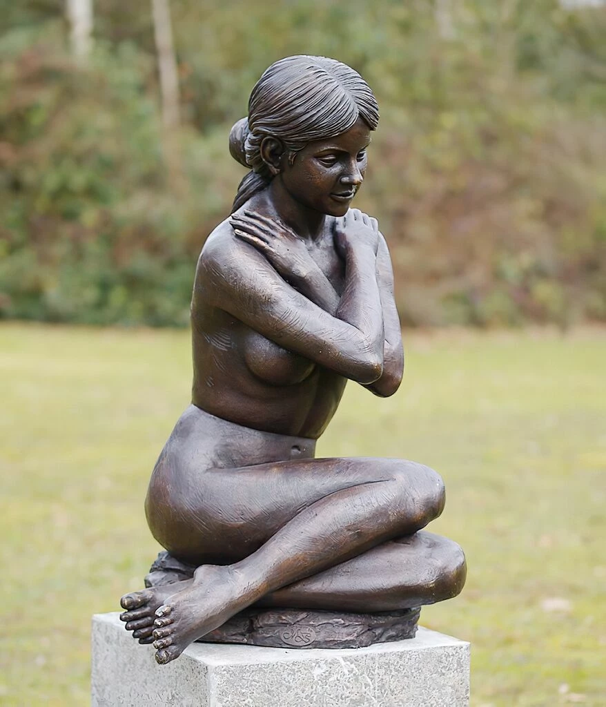 Diese Gartenskulptur einer nackten Frau aus Bronze zeigt ein weibliches Wesen von natürlicher Schönheit. Unsere bronzene Frau sitzt, die Beine zum Körper hingezogen, ihre Arme vor der Brust verschränkt und auf den Schultern abgelegt sowie den Kopf sanft geneigt auf einem kleinen Felsen und scheint zu träumen. Die erdig-sonnigen Schattierungen der edlen Bronze gekonnt nutzend, bereichert diese Gartenskulptur einer nackten Frau aus hochwertiger Bronze einfach jeden Standort.