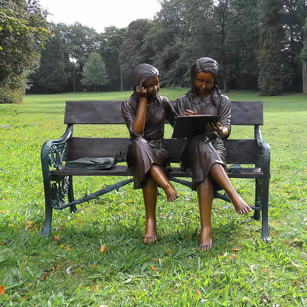 Diese hinreißende Gartenstatue aus Bronze zeigt zwei auf einer Bank sitzende junge Mädchen beim Zeichnen. Das eine Mädchen hält eine Zeichentafel und einen Stift in ihren Händen, während das andere interessiert zuschaut. Die Beine der Mädchen sind nahezu parallel übereinandergeschlagen, was diese hübsche Gartenstatue aus Bronze zu einer harmonischen Einheit werden lässt. Subtil die erdig-sonnigen Schattierungen der edlen Bronze nutzend, bereichert diese feine Bronze-Skulptur einfach jeden Standort im Garten. Hergestellt in aufwändiger Handarbeit im traditionellen Bronzegussverfahren beeindruckt diese Gartenstatue der Mädchen auf einer Bank sitzend aus Bronze durch die Ausarbeitung bis ins kleinste Detail und das gelungene Finish.