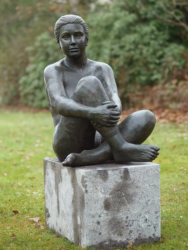 Das innere Gleichgewicht gefunden und den Blick klar nach vorn gerichtet sitzt diese Bronzefigur in Gestalt einer nackten Frau auf einem Sockel aus Stein. Leicht nach hinten gelehnt, die Beine angewinkelt und sich mit beiden Händen am rechten Bein haltend, scheint es so, als sei unsere Bronzefigur für den Garten Beobachterin eines interessanten Treibens. Durch die entspannte Körperhaltung dieser kunstvollen Gartenfigur aus Bronze wird die Wirkung ihres streng nach hinten gekämmten Haares sanft gemildert, was diese Bronzefigur zu einem harmonischen Gesamtkunstwerk auch in Ihrem Garten macht.