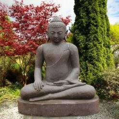 Dieser sitzende Buddha wird in Handarbeit aus Naturstein gefertigt. Bei dem verwendeten Material handelt es sich um Rhyolith, einem rotbraunem Lavagestein welches auf den Inseln Indonesiens sehr weit verbreitet ist. Der Buddha ist witterungsbeständig und frostfest und kann somit ganzjährig im Freien verbleiben. Buddhafiguren symbolisieren die Reinheit und Vollkommenheit des Geistes und sind in Asien weit verbreitet. Mit dieser wundervollen Steinskulptur können auch Sie sich ein Stück asiatischer Kultur in Ihren Garten holen.