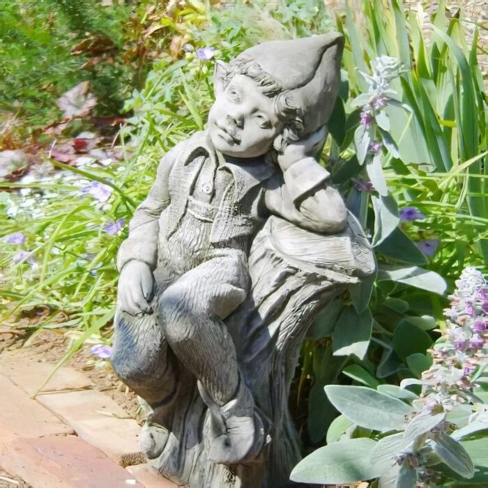 Niedliche Wichtelfigur aus Stein, am Baumstamm lehnend