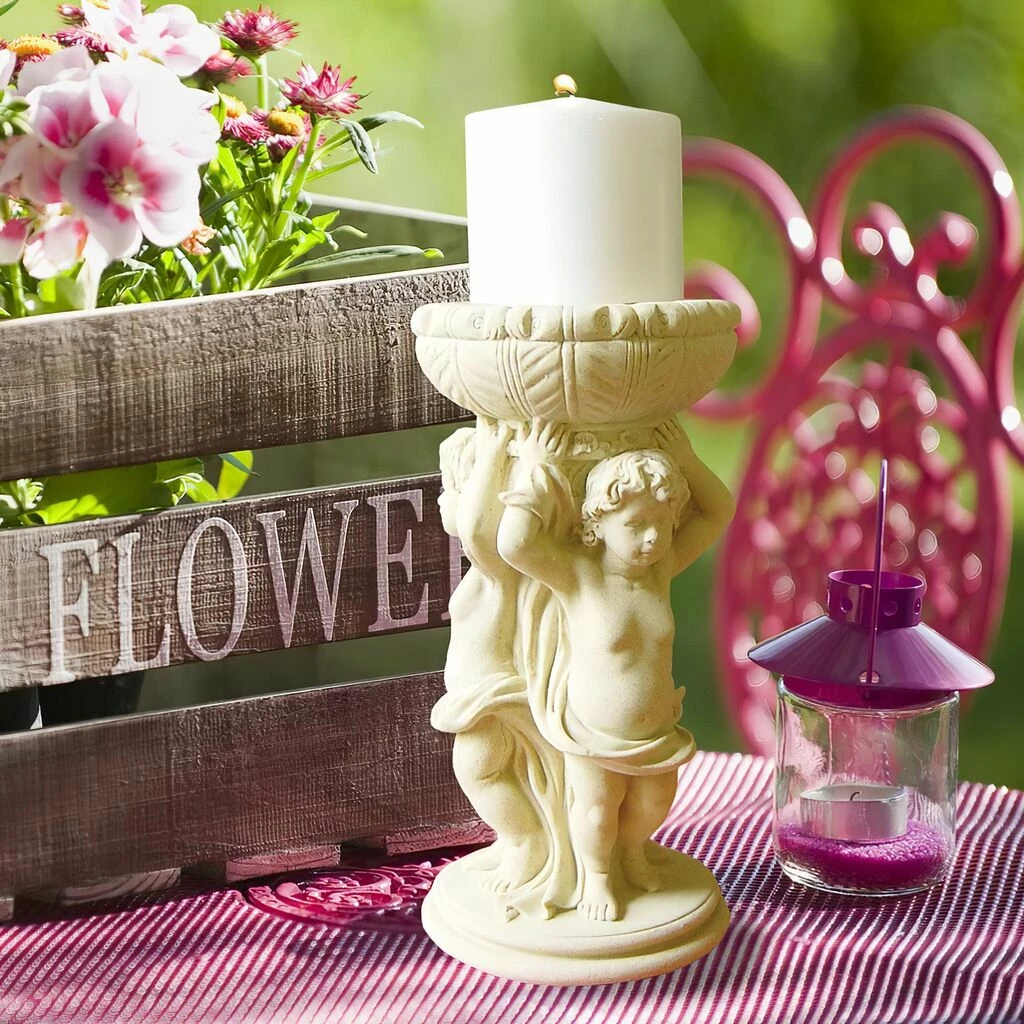 Wir freuen uns, dass Sie sich für unseren romantischen Deko Kerzenhalter aus Stein interessieren. Diese hübsche Bildhauerarbeit als Gartendekoration der besonderen Art besticht durch ihre liebevolle und detailverliebte Ausarbeitung und setzt reizvolle Akzente in Ihrem Garten. Diese Gartenskulptur besteht aus einem Ensemble dreier um eine Säule gruppierter Putten, die eine reich verzierte Schale in die Höhe halten. Diese schöne Dekoidee eignet sich hervorragend als Kerzenständer oder Pflanzensockel im Garten, ist aber auch als Grabschmuck sehr beliebt. Ob Fensterbank, Gartentisch, Terrasse oder Steintreppe – unsere steinerne Engeldekoration setzt nahezu jeden Gartenbereich stimmungsvoll in Szene und sorgt bei Kerzenschein für eine gemütliche Atmosphäre an lauen Sommerabenden. Auf Wunsch können Sie diesen ockerfarbenen Stein Kerzenhalter mit Engelfiguren auch mit einer antiken Patina versehen oder als Dekoskulptur aus weißem Steinguss hier bei GARTENTRAUM risikolos und versandkostenfrei bestellen und kaufen.