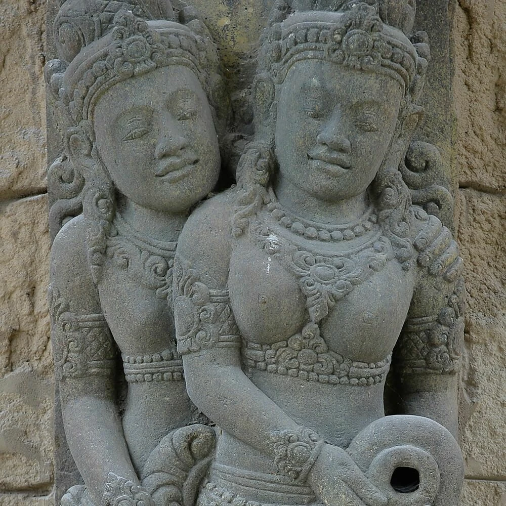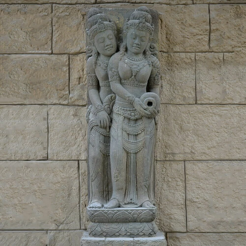 Charakteristisch für das Vulkangestein Basanit ist der leicht grünliche Schimmer, welcher durch die im Gestein enthaltenen Tonmineralien entsteht. Alle Skulpturen aus Basanit werden im traditionellen Steinmetz Handwerk von Hand bearbeitet, sodass jede Skulptur ein Unikat darstellt und in Farbe und Form leicht variieren kann. Während der Frostperiode sollte die Figur nicht im Wasser stehen, da Basanit nicht tausalzbeständig ist. Tausalz kann Strukturveränderungen am Stein herbeiführen.