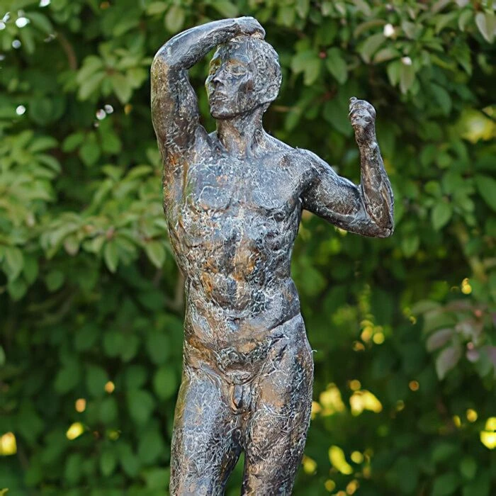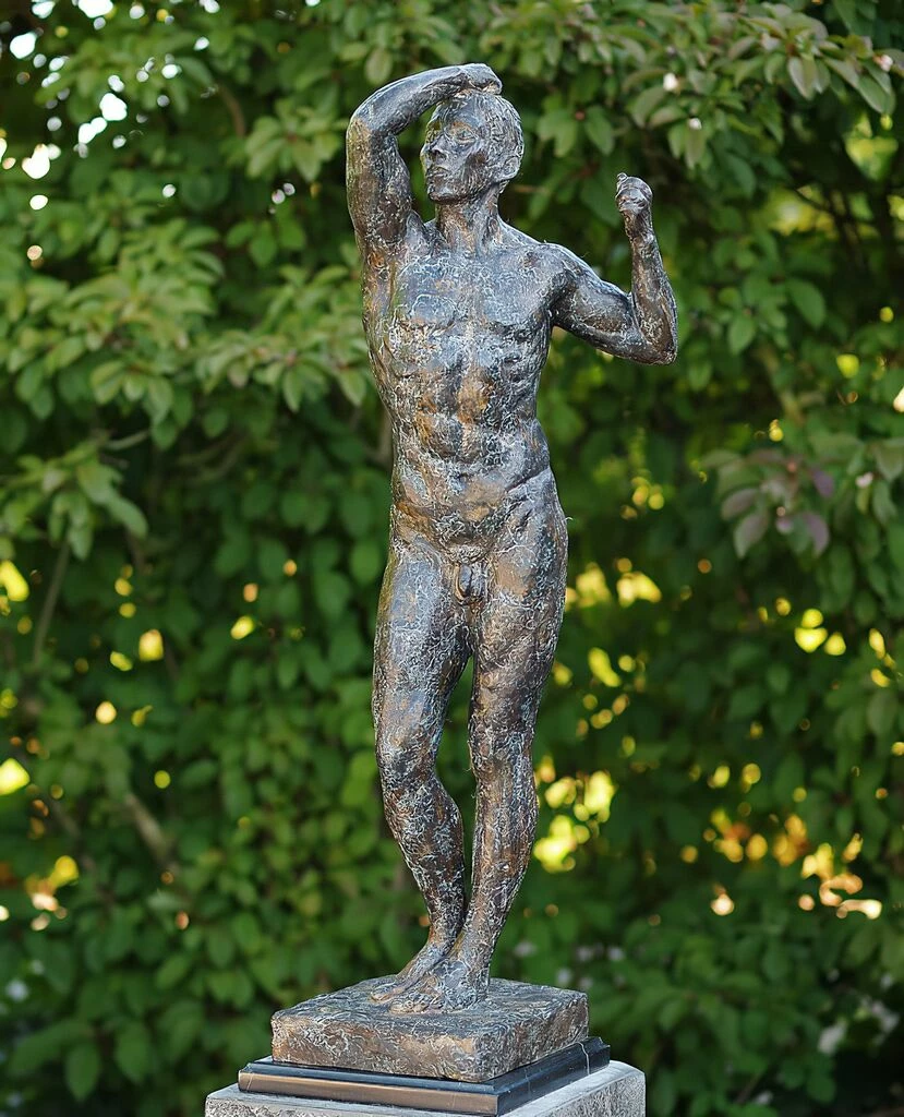 Nach Vorlagen des Bildhauers Auguste Rodin entstand diese edle Statue – der Nackte Mann aus Bronze. Die Statuen Rodins waren wegweisend für die Moderne und stehen für ein neues Zeitalter dreidimensionalen künstlerischen Schaffens. Seinen makellosen und athletischen Körper fast ein wenig selbstverliebt zur Schau stellend, begegnet uns diese edle Bronzestatue eines nackten Mannes, der mit leicht angestelltem Bein und sich mit einer Hand durch das Haar streichend auf einem Sockel aus Bronze steht. Die Muskeln des nackten Mannes sind bei dieser beeindruckenden Statue aus edler, patinierter Bronze deutlich herausgearbeitet. Unsere Rodin-Skulptur aus zeitloser Bronze ist eine Bereicherung für jedes anspruchsvolle Gartenambiente.