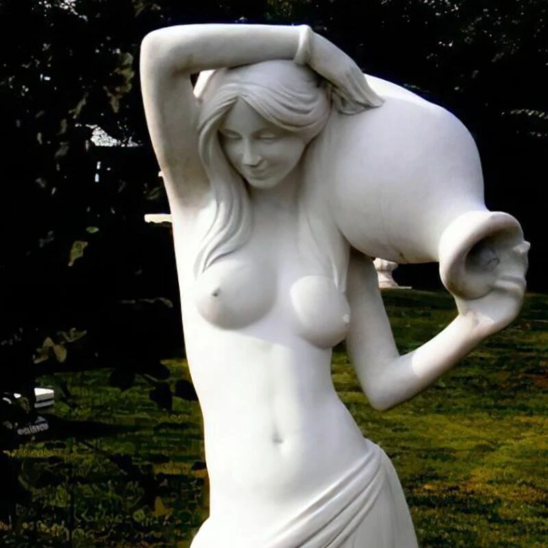 Die anmutig wirkende Frau trägt einen Krug auf der Schulter. Das detailreiche Design macht die Outdoor Skulptur zu einem Blickfang im Garten oder auf einer Parkanlage. Gefertigt wird der Frauenakt aus Steinguss, welcher in einer großen Auswahl von Farbpatina gefärbt werden kann.