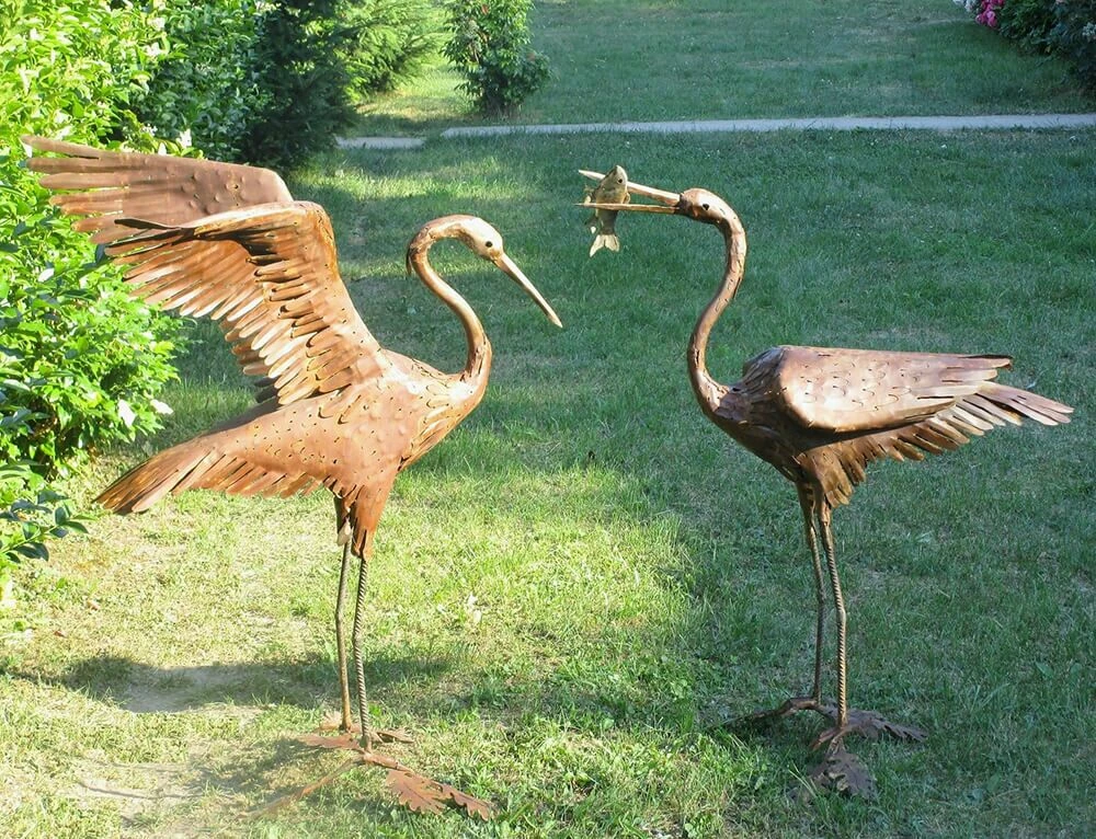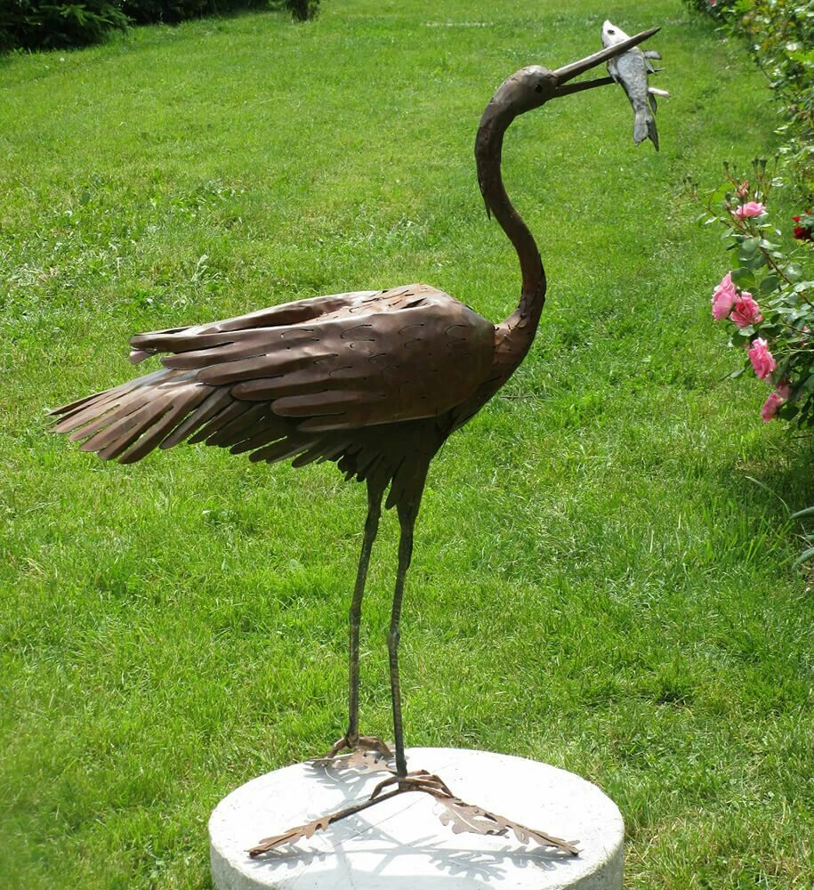 Bei den außergewöhnlichen Reiher Skulpturen des ungarischen Künstlers handelt es sich um handwerklich hergestellte Unikate. Die Skulpturen werden in klassischer Handarbeit gefertigt. Die Herstellung erfolgt entweder aus nicht rostendem Edelstahl oder aber aus Stahl (St37) welcher mit Säure behandelt wird damit die attraktive Rost Patina entsteht. Die rostigen Skulpturen werden mit einer Schutzschicht versehen um die Lebensdauer (ca. 50 Jahre) der Figuren zu erhöhen. Nach 50 Jahren können die Gartenskulpturen restauriert werden. Der verwendete Stahl hat eine Materialstärke von ca. 0,5-0,8mm. Entsprechende Befestigungsvorrichtungen für die Bodenmontage sind in Form von Schrauben oder Ösen bauseits bereits berücksichtigt, so dass eine einfache Montage der Skulpturen im Garten erfolgen kann.