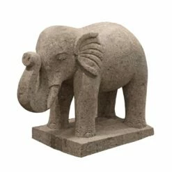 Diese Gartenfigur eines stehenden Elefanten wird aus dem vollen Stein gehauen. Der verwendete Basanit, ein Lavagestein, ist wetterfest und frostbeständig und die Skulptur somit für die dauerhafte Aufstellung im Außenbereich geeignet. Dank der klaren Formen der Statue wurde eine zeitlose Kunst geschaffen mit der Sie individuelle Akzente in Ihrem Gartenreich setzen können.