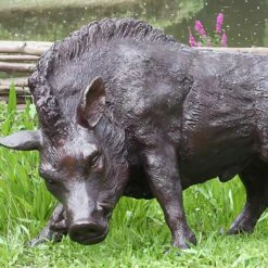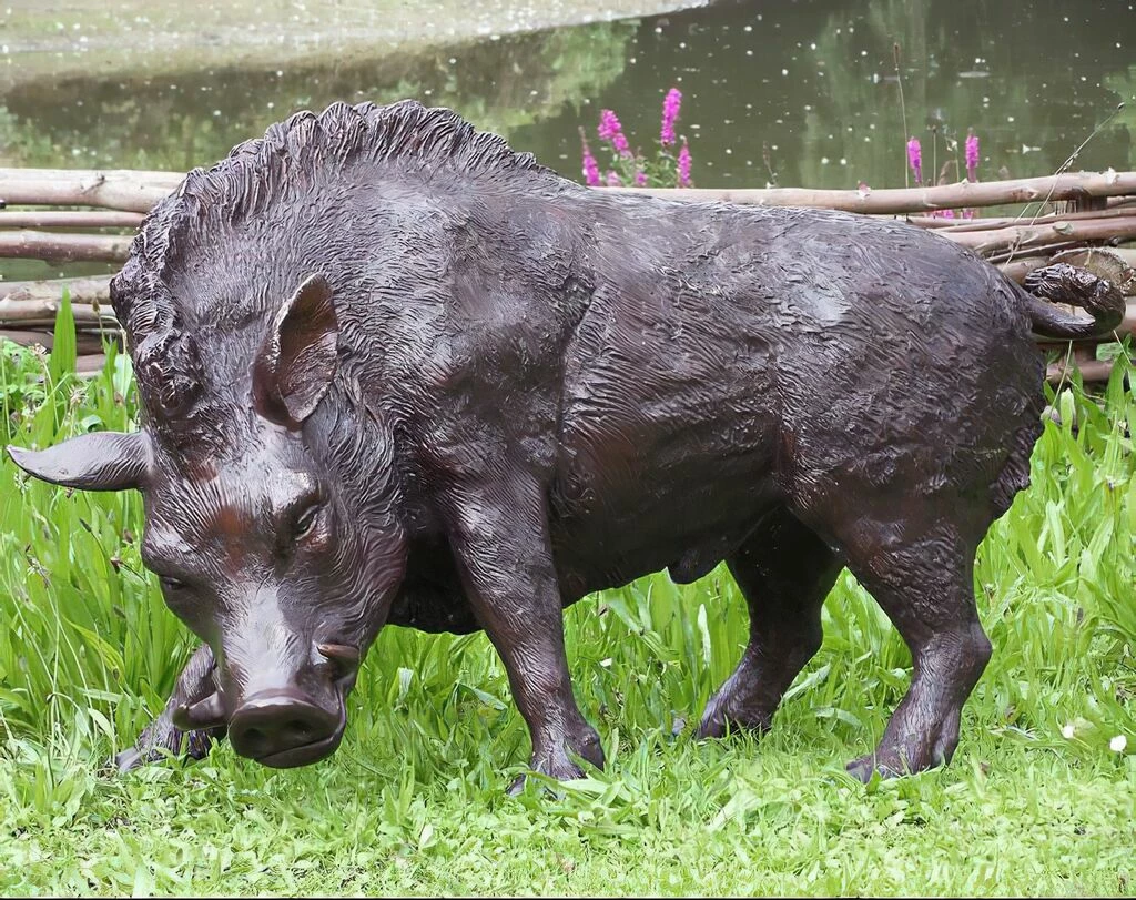 Diese große Skulptur mit einem Wildschwein könnte ein Stück unberührter Natur auch in Ihren Garten bringen. In imposanter Gestalt, den Kopf zum Boden gesenkt und scheinbar jederzeit zum Angriff bereit, präsentiert sich diese mächtige und kraftvolle Skulptur eines großen Wildschweins. In Handarbeit im traditionellen Bronzeguss-Verfahren gefertigt, überzeugt unsere naturalistische und mit viel Liebe zum Detail ausgearbeitete große Skulptur aus Bronze nicht nur durch die ansprechende Erscheinung, sondern ebenso durch ihre Wetter- und Winterfestigkeit. Auf diesen Seiten finden Kunden neben dieser großen Wildschwein-Skulptur weitere stilvolle Gartenskulpturen aus Bronze, die wir online zum Kauf anbieten.
