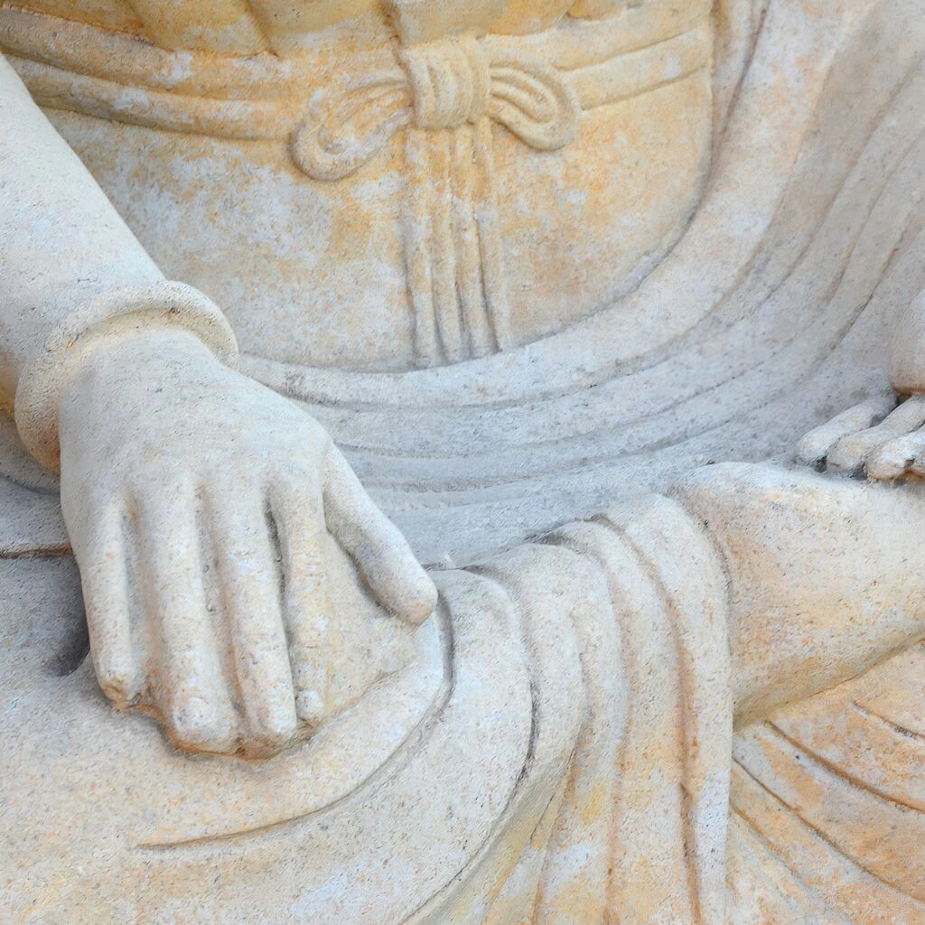 Herzlich Willkommen in unserem Buddha Onlineshop hier bei GARTENTRAUM. Wir freuen uns, dass Sie sich für unseren großen Buddha „Sila“ interessieren, der in dieser wertvollen Steinskulptur sitzend mit der typischen Geste der Erdberührung dargestellt wird. Dabei hängt der rechte Arm des Buddhas über dem Knie und die Handflächen zeigen nach innen. Alle Finger weisen nach unten. Die linke Hand der Steinfigur liegt mit der nach oben geöffneten Handfläche im Schoß. Der Buddha im Lotussitz berührt mit den Fingerspitzen die Erde, um sie als Zeugin für die Wahrheit seiner Worte anzurufen. Diese große Buddha Steinstatue vermittelt eine klare und ruhige Ausstrahlung und spiegelt die Werte des Buddhismus deutlich wider. Die der Figur innewohnende Weisheit und Güte wird durch diese meisterliche Bildhauerarbeit und durch die Wärme des ockerfarbenen Sandsteins besonders betont. Das meditative und den Geist erfrischende Lebensgefühl des Buddhismus können Sie mit dieser eindrucksvollen Buddha Gartenfigur aus edlem Steinguss auch in Ihrem Heim fernab Asiens erleben. Probieren Sie es aus!