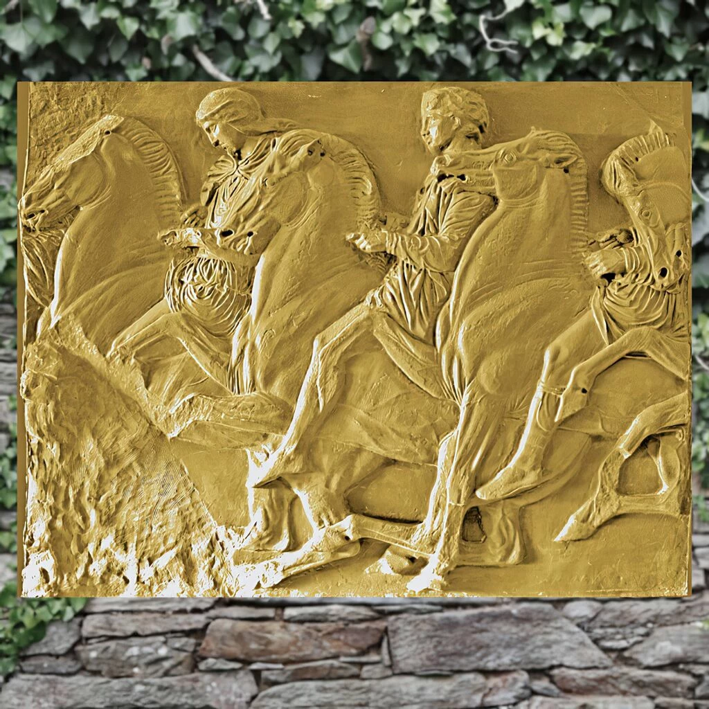 Dieses große historische Wand Relief mit Kriegern wurde nach antiken Vorlagen gestaltet. Das Original stammt aus dem Parthenon in Athen. Die Reiter waren dort auf dem nördlichen Fries dargestellt. Passend dazu finden Sie in unserem einzigartigen Sortiment auch ein weiteres ergänzendes Relief. Ob zusammen oder einzeln, dieses wundervolle Wandrelief ist ein attraktiver Hingucker im Garten oder Haus.