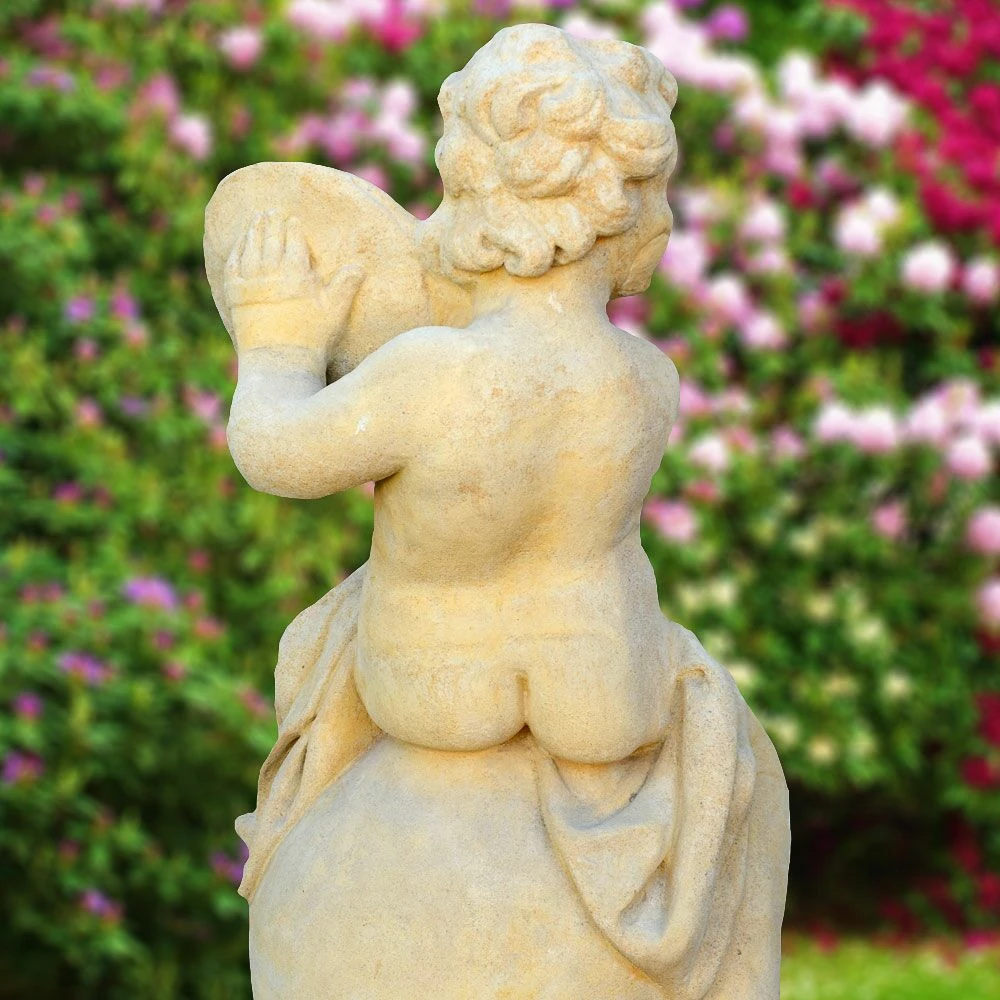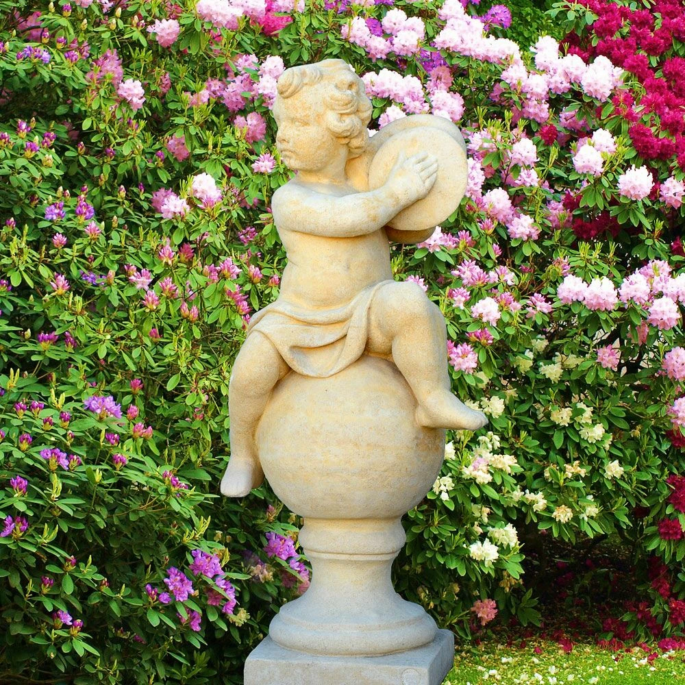 Romantische Gartenszenerie mit einer Puttenfigur aus Stein zaubern: Mit einer historischen Steinfigur wie unserer Barockputte „Batteur“ bringen Sie nicht zuletzt etwas Träumerei und Leichtigkeit in Ihren Garten gleichermaßen wie in Ihr Leben. Keck sitzt unsere Steinputte auf einer Kugel und bezaubert mit einer kleinen Trommel, die der romantischen Steinfigur einen musikalischen Anstrich verleiht. Nach historischen Vorbildern aus barocken Gärten und Parkanlagen entstehen diese aufwändig gestalteten Gartenputten in traditioneller Handarbeit aus feinstem Steinguss. Der ockerfarbene Sandstein verleiht unserem steinernen Amor zudem eine warme Ausstrahlung und bringt die vollplastischen Formen dieser wertvollen Künstlerarbeit bestens zur Geltung. Damit sich unsere schöne Steinskulptur auch in viele Gartenstile harmonisch integrieren lässt, bieten wir die Statue in unterschiedlichen Steinvarianten hier bei GARTENTRAUM zum Kaufen an. Auf einer gepflegten Rasenfläche in der Gartenmitte, am Ende einer Sichtachse im Grünen oder ganz romantisch neben einem Rosenbogen platziert wird diese historische Steinfigur als Putte an vielerlei Plätzen im Garten für einen stimmungsvollen Blickfang sorgen. Probieren Sie es aus…