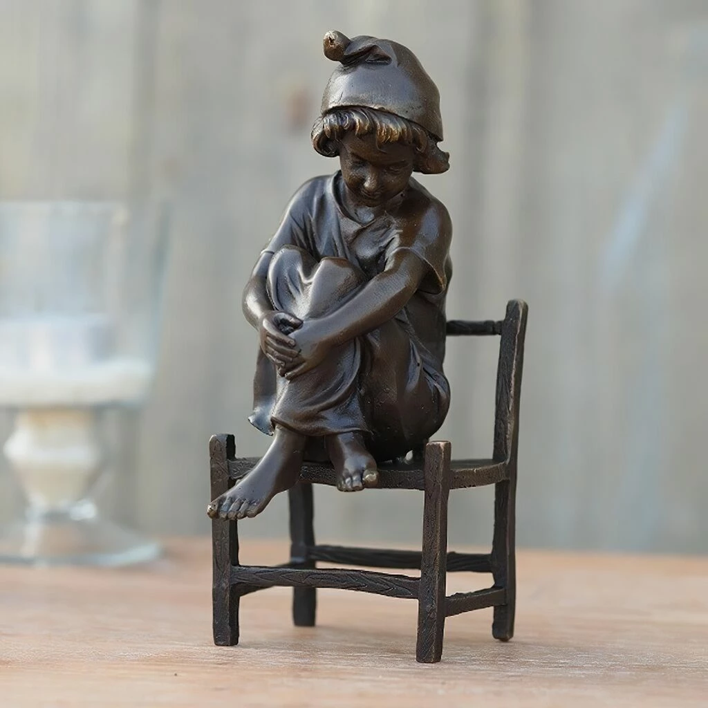 Nachdenklich auf einem Stuhl sitzend, ist diese Jungenfigur ein kleines Deko-Highlight aus robuster Bronze. Die Skulptur wird im traditionellen Gussverfahren hergestellt und dunkel patiniert.