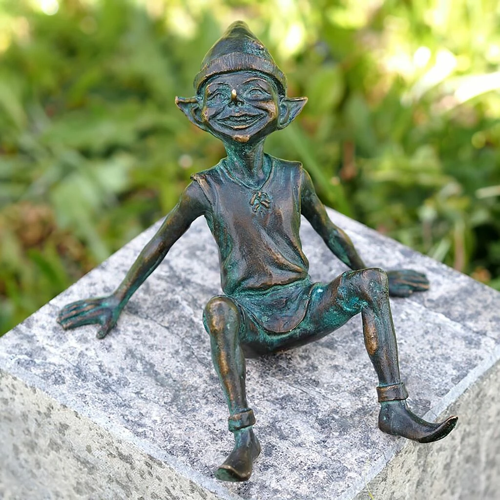 Kleiner Kobold Sitzt Und Lacht – Mystische Gartenfigur Aus Bronze – Pixie Lizzi