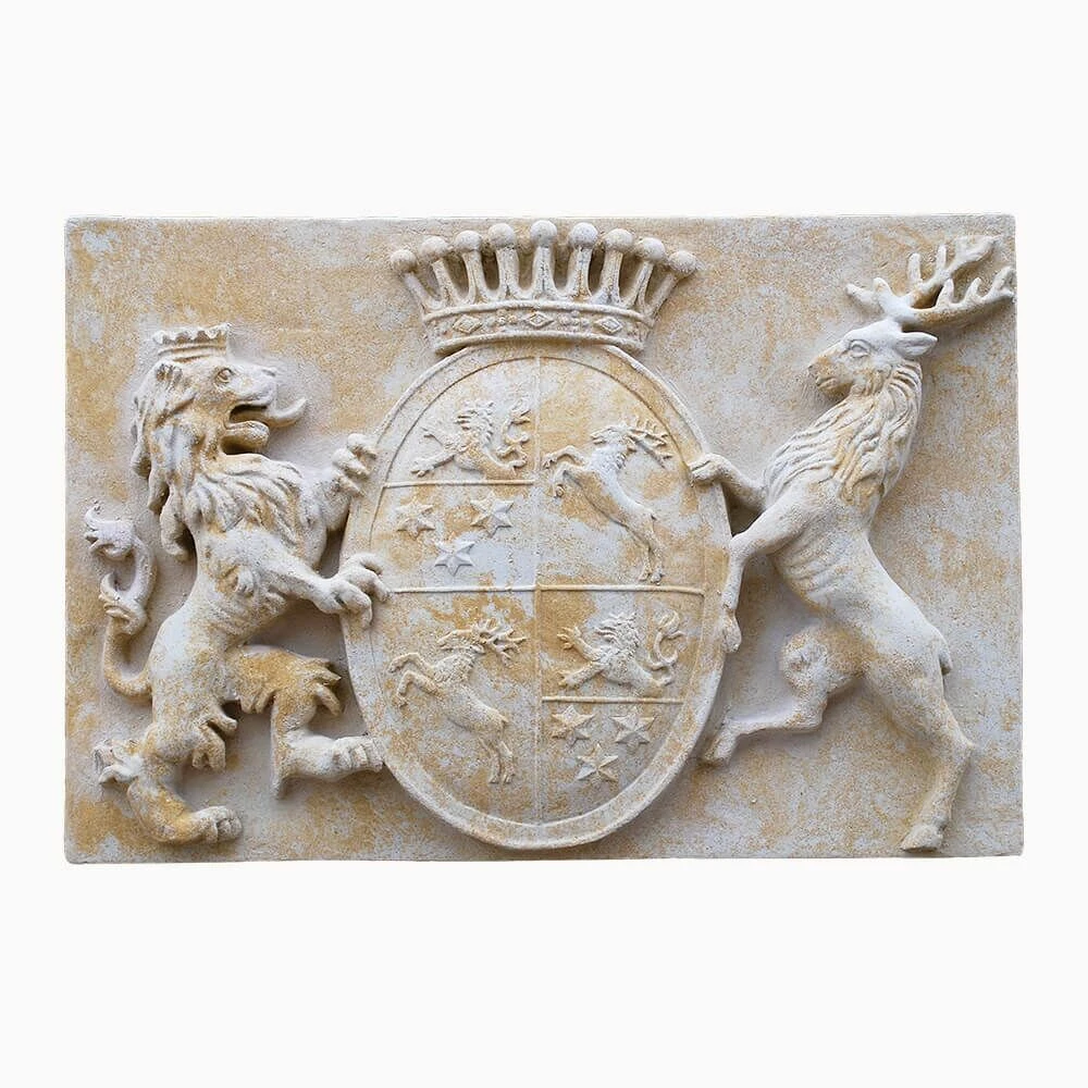 Das wunderschöne königliche Wandrelief aus Steinguss besitzt ein Gewicht von 40kg und hat eine Größe von 54x80x10cm (Höhe x Breite x Tiefe). Es ist speziell für die Aufwertung von Mauern und Wänden konstruiert. Der verwendete Steinguss besteht aus einer speziellen Mischung von verschiedenen Werkstoffen. Dabei werden Sand, Weißzement und Eisenoxyd unter hohem Druck und der Zugabe von Wasser in Kautschukformen eingeschlagen. Für die Bindung der Elemente wird nur wenig Wasser verwendet, somit ist ein Porenfreies Endprodukt garantiert, das auch die härtesten Frostperioden überstehen kann. In Handarbeit werden die gegossenen Skulpturen nachmodelliert und erhalten so ihren individuellen Charakter. Durch die Top Qualität des Steingusses ist dieses Wandrelief besonderes langlebig und besitzt eine starke Witterungsbeständigkeit.