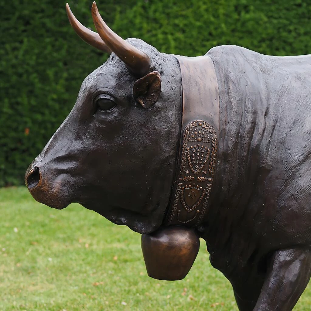 Mit ihrer Glocke um den Hals ist diese Kuh als Gartenskulptur lebensecht aus Bronze im Gussverfahren gefertigt. Eine schöne Patina verleiht der Kuhfigur einzigartige Akzente.