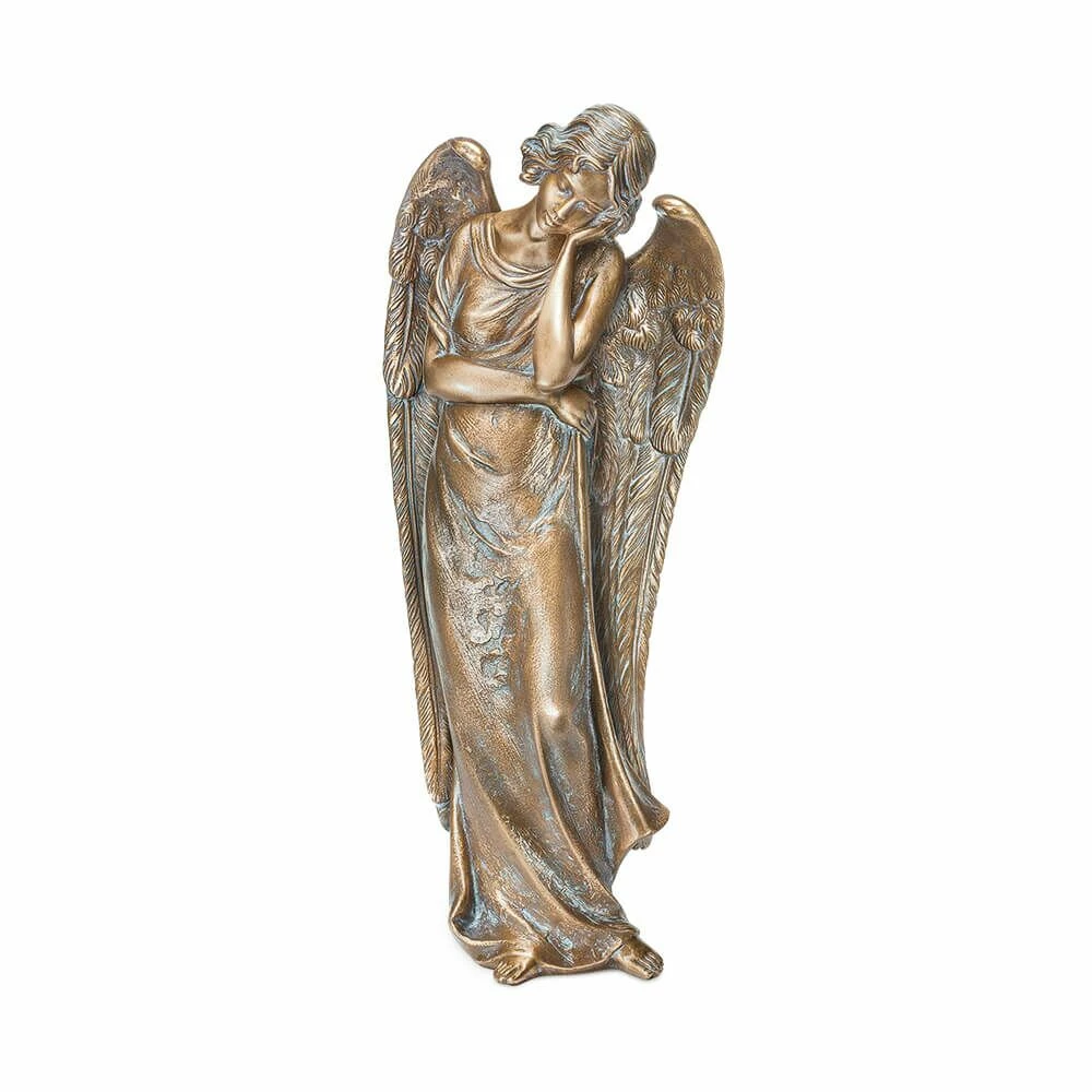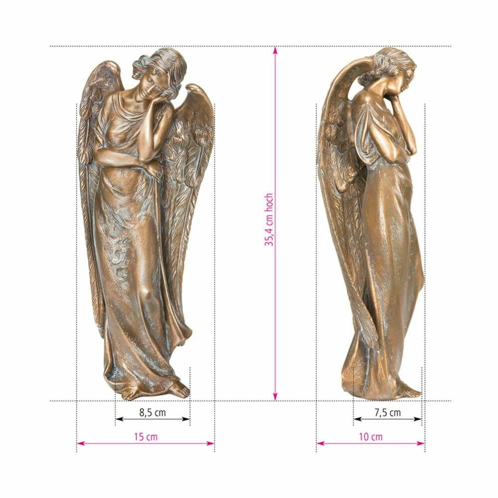 Aus Bronze oder Aluminium gefertigt, ist diese Engelfigur wetterfest und robust. Neben der abgebildeten Ausführung mit Wachsgusspatina und in Aluminium grau, sind unterschiedliche Farbnuancen möglich.