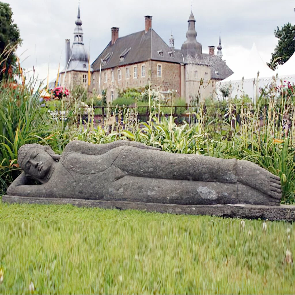 Mit dieser Steinfigur eines Buddhas, der hier traditionell liegend dargestellt wird, erwerben Sie ein Unikat, das vom indonesischen Künstler Mukit in sorgfältiger Handarbeit aus einem Natursteinblock geschlagen wird. In langwierigen und aufwändigen Arbeitsschritten stellt er diesen liegenden Naturstein Buddha her. Der Buddha ist garantiert aus dem vollen Stein heraus handgeschlagen und damit einzigartig. Als Material verwendet der Bildhauer Basanit, ein dem Basalt ähnelnder Naturstein. Schon die alten Ägypter schätzten die Qualität dieses Natursteins und stellten daraus zahlreiche ihrer Statuen her. Basanit ist ein frostfester Stein, der auch in einem strengen Winter keinen Schaden nimmt. Somit wird Ihnen unser liegender Naturstein Buddha zu jeder Jahreszeit Freude in Ihrem Garten bereiten.