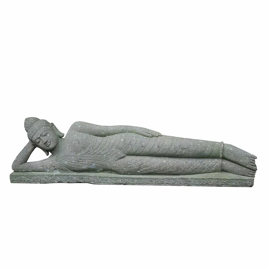 Dieser liegende Naturstein Buddha stellt den Erleuchteten im Moment seines Eingangs ins Nirwana dar. Die große Buddhastatue überzeugt durch die Verbindung von weichen Formen und hartem Gestein. In dieser Kombination übt der liegende Buddha einen ganz besonderen Reiz auf den Betrachter aus. Der entrückte Zustand des Buddhas aus Naturstein überträgt Ruhe und Entspannung auf seine Umgebung. Die grünliche Färbung des Steins verleiht der Buddhafigur seine ganz besondere Ausstrahlung. Lassen Sie sich in den Bann dieses großen Naturstein-Buddhas ziehen und genießen Sie die besondere Atmosphäre asiatischer Steinkunst.