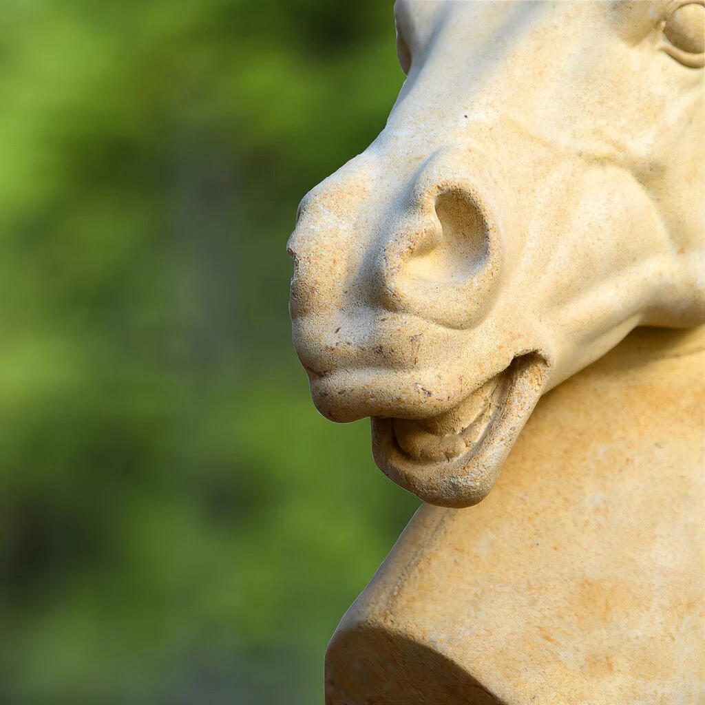 Pferde gelten als Symbol für Ausdruckskraft, Stärke, Ausdauer aber auch Edelmut. Die Tiere waren schon früh Gegenstand von Kunst und Kultur. Die Büste vereint all diese Eigenschaften und macht damit jeden Garten zu einem Hingucker. Erreicht wird dies durch die hochwertige Verarbeitung. In liebevoller Handarbeit wird die Skulptur in traditioneller Bildhauerkunst gefertigt. Die Pferdestatue wird im modernen Elbsandsteinguss-Verfahren hergestellt, welches jeder Büste einen individuellen Wert verschafft. Elbsandsteinguss ist witterungs- und frostbeständig. Somit kann der Pferdekopf an jede Stelle des Gartens oder der Veranda eindrucksvoll thronen. Zwei der Tierfiguren, sich gegenseitig von Säulen feurig anschauend, lassen jedes ausdruckslose Gartentor eindrucksvoll erscheinen. Mit Hilfe eines Überzuges aus Patina kann der Steinfigur ein antik wirkendes Aussehen verliehen werden. Diese einzigartige Dekorationsstatue kann exklusiv bei GARTENTRAUM, inklusive Anlieferungsservice, bestellt werden.