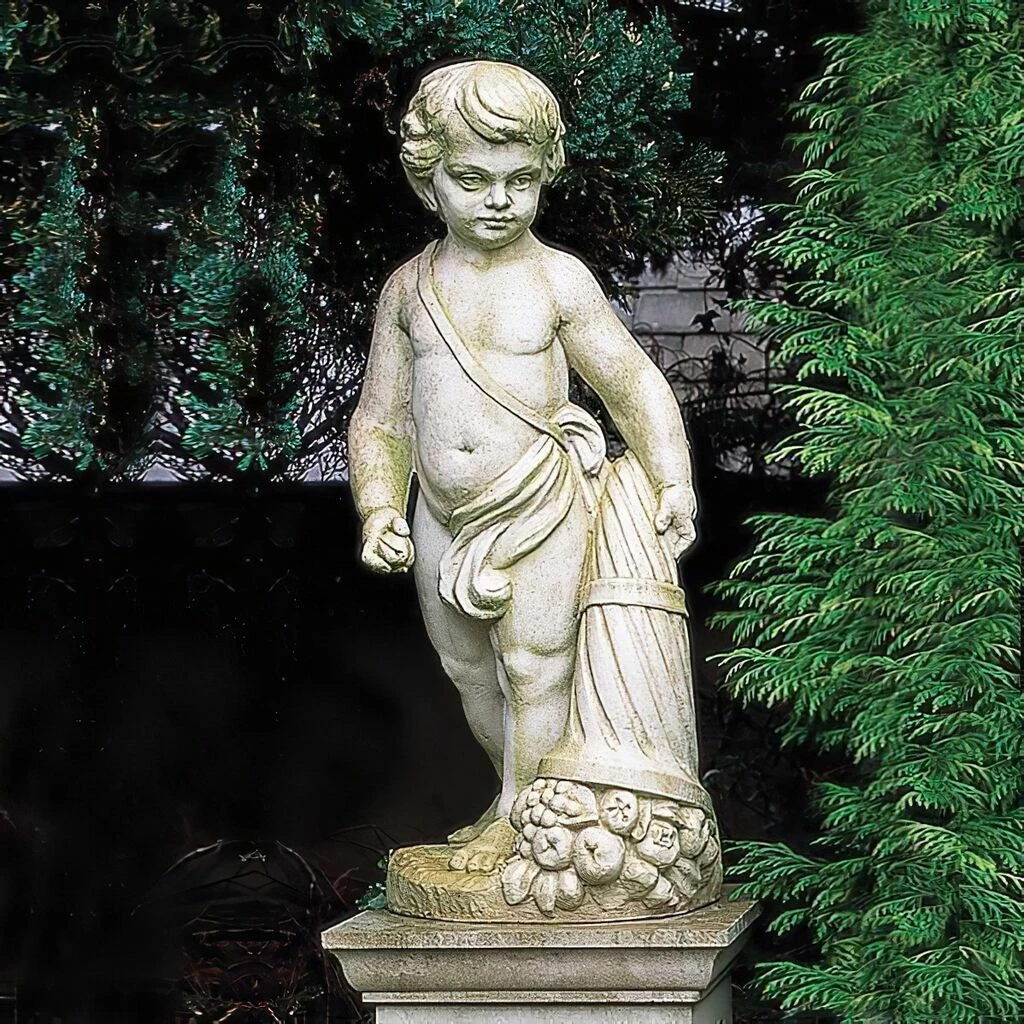 Die Qualitätsarbeit ist Teil unserer kleinen Reihe edler Putten für den Garten, bei denen die vier Elemente Erde, Feuer, Luft und Wasser künstlerisch umgesetzt werden. Bei diesen Steinputten handelt es sich um originalgetreue Replikate der handgefertigten Skulpturen, die um das 18. Jahrhundert in Norfolk geschaffen und im berühmten Anwesen Elveden Hall ausgestellt wurden. Die Steingussfigur orientiert sich stilistisch an der Darstellung der Barockputte. Bis in das kleinste Detail ist die Gestalt des Kindes herausgearbeitet. Lediglich ein Tuch und ein Gurt bekleiden den Jungen. Der Korb mit den Feld- und Gartenfrüchten symbolisiert bei dieser Putte für den Garten das Element Erde. Als Dekofigur gewinnt die Gartenputte durch die ansetzende Patina zusätzlich an natürlicher Ausstrahlung. In den einzigartigen Farben Sand, Steingrau, Weiß und Terrakotta lässt sich die hübsche Steinputte hervorragend in ein bestehendes Gartenarrangement integrieren.