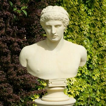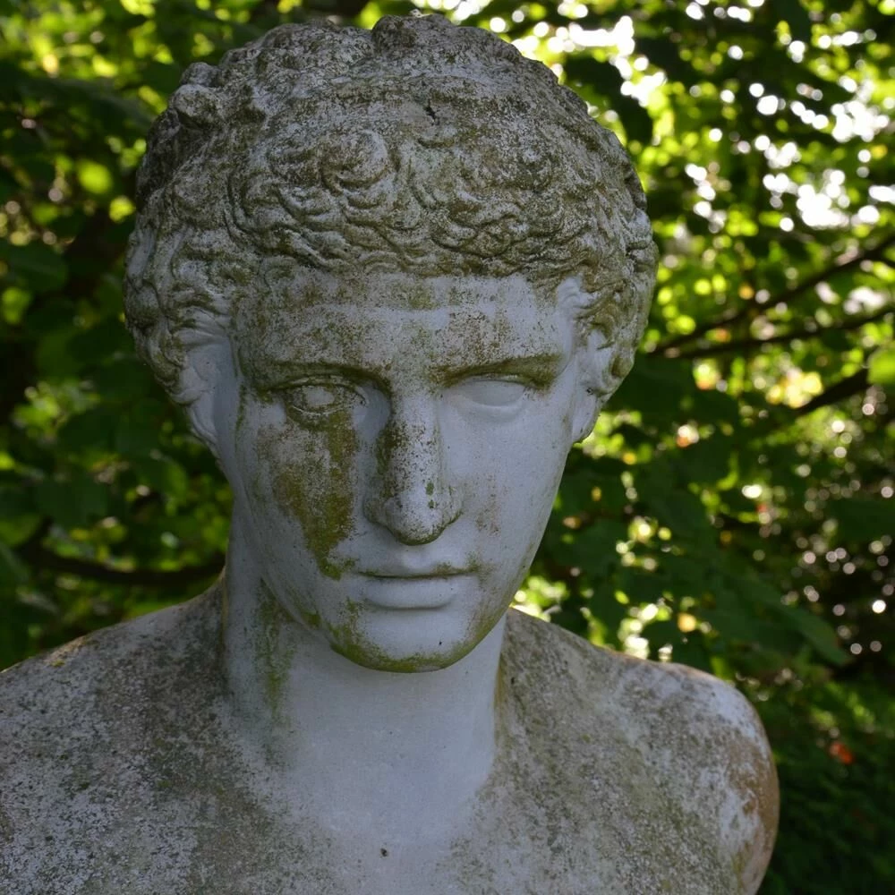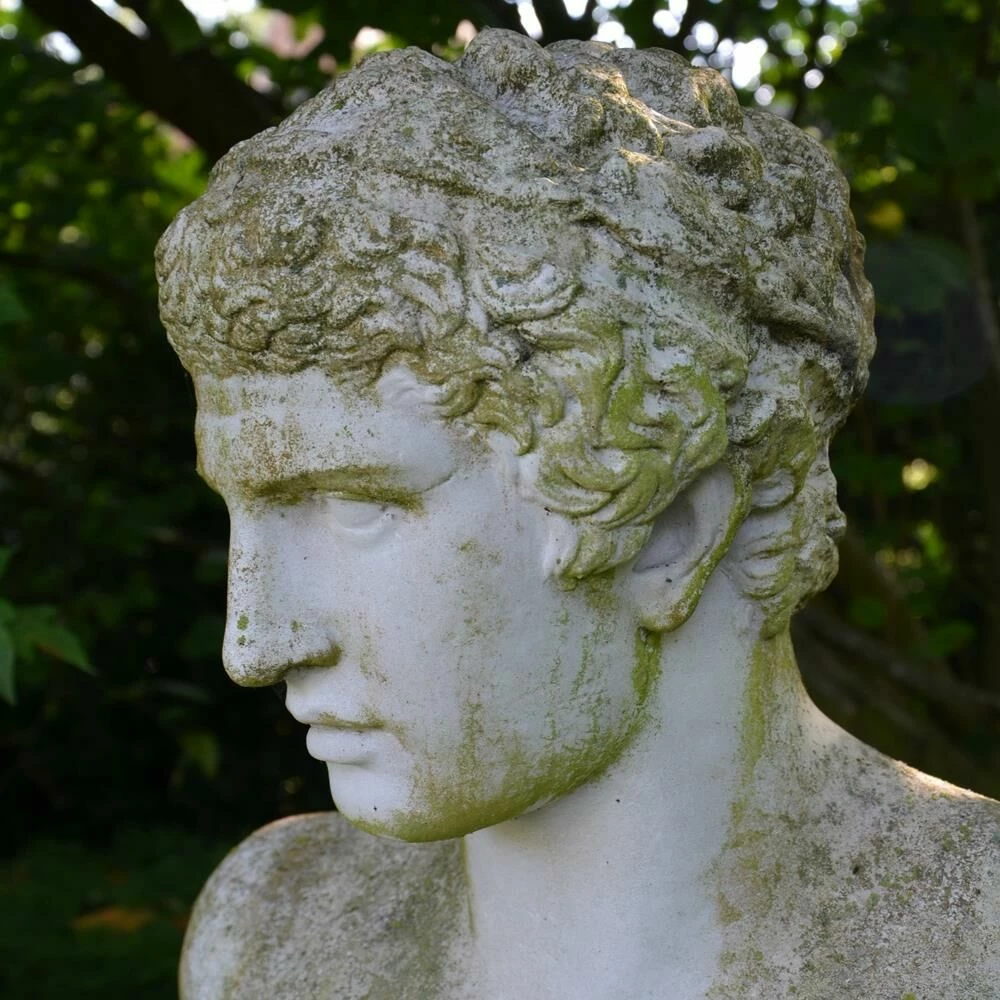 Der Jüngling Antinous ist hier als römische Stein Büste antik gefertigt und von bester Qualität. Ein steinernes Kunstwerk, das frostsicher und witterungsbeständig eine außergewöhnliche Dekoration für den Garten und die Terrasse darstellt. Die passende Umgebung für die Steinbüste Antinous ist der Garten. Je nach Stil und Gartenbepflanzung kann die antike Stein Büste in den edlen Farben Sand, Weiß, Terrakotta und Steingrau im Onlineshop bestellt werden. Ob als Begrüßungsfigur am Eingangstor, als Blickpunkt am Ende einer Sichtachse, als Steinskulptur in einer versteckten Gartennische oder als edle Dekobüste auf der Terrasse – diese römische Stein Büste sorgt für Begeisterung unter Kunstliebhabern und Gartenfreunden. Gefertigt wird die antike Büste im Steingussverfahren, bei dem in traditioneller Handarbeit aus einer Hohlform eine kleine Reihe antiker Replikate gewonnen wird. Die Verwendung hochwertiger Grund- und Zuschlagsstoffe garantiert die außerordentliche Festigkeit der Gartenbüste. Für Kunden aus Deutschland erfolgt die Lieferung aller griechischen und römischen Stein Büsten, Skulpturen und Plastiken versandkostenfrei in den Garten.