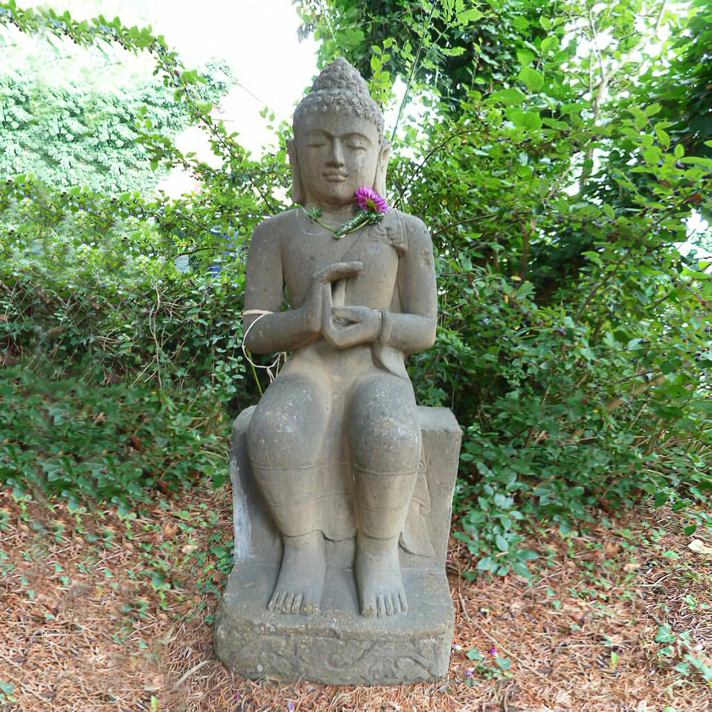 Dieser sitzende Buddha als Steinfigur präsentiert sich seinem Betrachter mit einer Handhaltung, die als Gebärde des Rades der Lehre bezeichnet wird. Diese Geste wird auch als Mudra der Diskussion bezeichnet. Hierbei Formen Daumen und Zeigefinger der Buddha Steinfigur das Rad der Lehre, die anderen Finger sind nach oben gerichtet. Diese klassische Darstellung des Rades der Lehre, auch Dharma-Rad genannt, zeigt ein kunstvolles Andachtsbild des lehrenden Buddhas, sitzend auf einem Sockel aus Stein. Unser sitzender Buddha als Gartenfigur wird in traditioneller Handarbeit aus Naturstein gehauen und ist somit wetterbeständig und frostsicher. Da es sich bei unseren Buddha Steinfiguren um echte Naturprodukte aus hochwertigem Naturstein handelt, kann jeder Gartenbuddha aus Stein in Struktur und Farbe leicht vom hier dargestellten Beispielbild abweichen. Dieser sitzende Buddha als Steinskulptur ist ein Blickfang auch in Ihrem Garten.