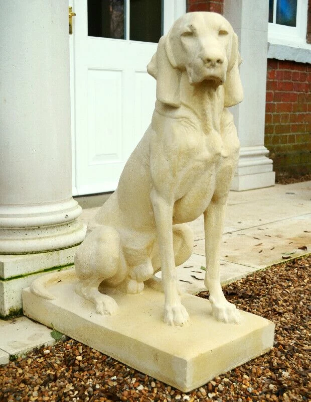 Diese Skulptur eines Jagdhunds für den Garten wird aus winterfestem Steinguss gefertigt. Hergestellt wird die Hundeskulptur in einer englischen Künstlerwerkstatt. Als Vorlage dienen antike Vorlagen des bekannten Pariser Bildhauers Alfred Jacquemart. Jacquemart ist bekannt für seine ansprechenden Tierskulpturen. Neben diesem Jagdhund, hat er auch eine weitere Hundestatue gestaltet die Sie ebenso in unserem Online Shop finden. Zusammen ergeben die beiden Hunde einen schönen Blickfang für einen stilvoll gestalteten Hauseingang.