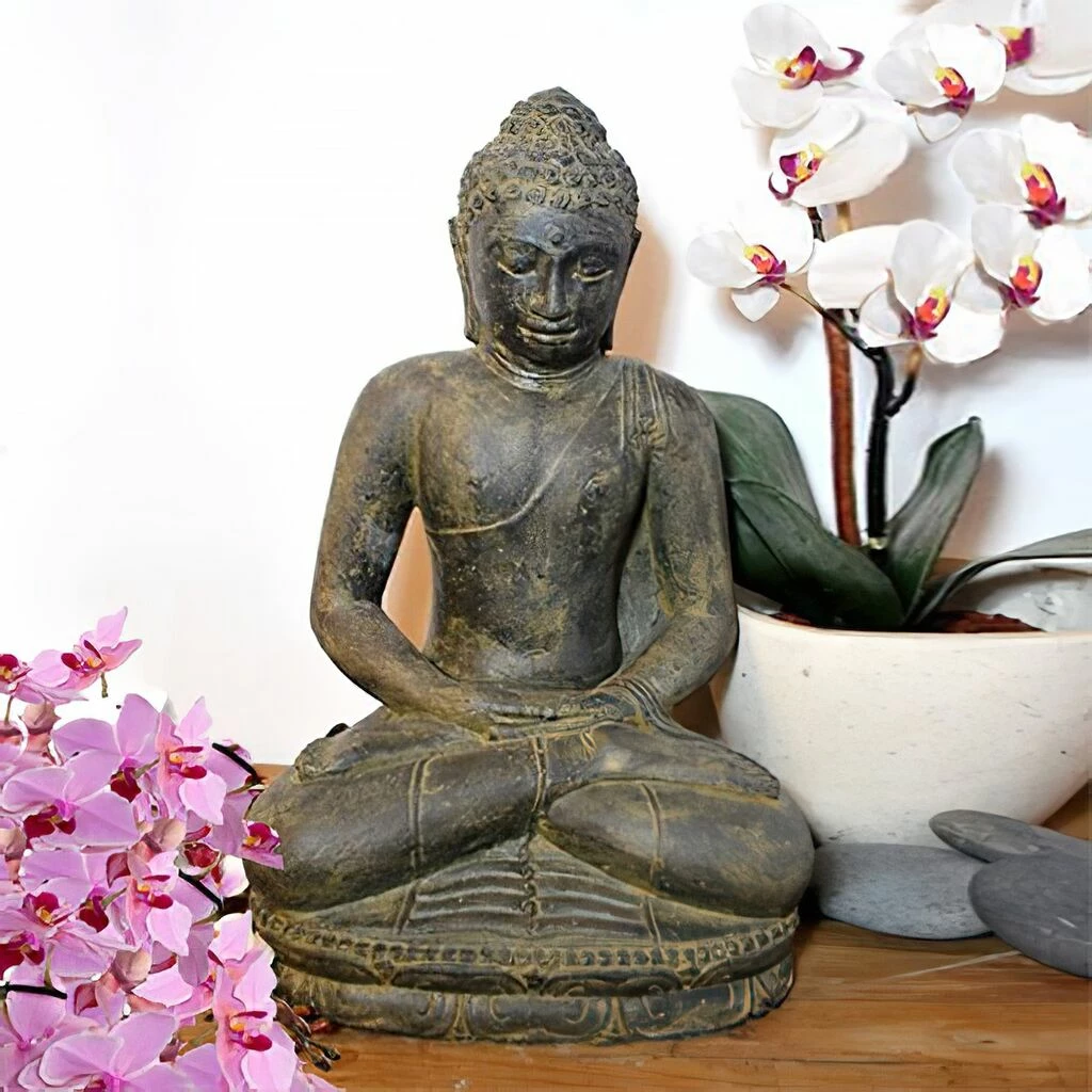 Mit viel Liebe zum Detail hergestellt, wird Sie unser sitzender Buddha als hochwertige Steinfigur gewiss begeistern. Das Aufstellen einer Buddhafigur in Haus und Garten drückt einen bestimmten Lebensstil aus, der von Achtsamkeit, Gelassenheit und dem Ausgleich zwischen Ruhe und aktivem Leben geprägt ist. Durch seine ruhige und harmonische Ausstrahlung verleiht dieser sitzende Buddha aus Antik Steinguss seiner Umgebung eine stimmungsvolle Aura und versprüht fernöstliches Flair. Die hier dargestellte, sitzende Steinfigur eines meditierenden Buddhas strahlt Zufriedenheit und Harmonie aus. Unsere Buddha Steinfiguren sind aus hochwertigem Steinguss von Hand hergestellt sowie wetterbeständig und frostfest. Aus dem vollen Stein gefertigte Originale dienen als Vorlage für diese Buddha Steinskulpturen. In einer Buddha Statue vereinigt sich der Aspekt der stimmungsvollen Dekoration mit der hohen Wertigkeit der Steinfigur durch die einzigartige Fertigung in traditioneller Handarbeit.