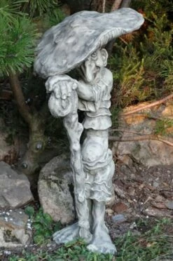 Die Figuren werden aus hochwertigem Stein im Steingussverfahren gefertigt. Beim traditionellen Gussverfahren werden natürlicher Stein in Form von Sand, Zuschlagstoffe, Portlandzement und Wasser vermischt. Die Mischung wird mittels aufwendiger Techniken in eine Hohlform gegossen, um Luftlöcher zu verhindern. Dies garantiert eine hohe Frostfestigkeit. Nach dem Austrocknen der gehärteten Kunststeinmasse wird die Figur vorsichtig aus der Hohlform gelöst und zum Aushärten an der frischen Luft wettergeschützt gelagert. Danach erfolgt die weitere Verarbeitung in liebevoller Handarbeit. Hierbei kommt zu kleinen individuellen Details, welche die Gartenskulptur einzigartig werden lassen. Nach der Fertigung erhält die Figur ihre Färbung.