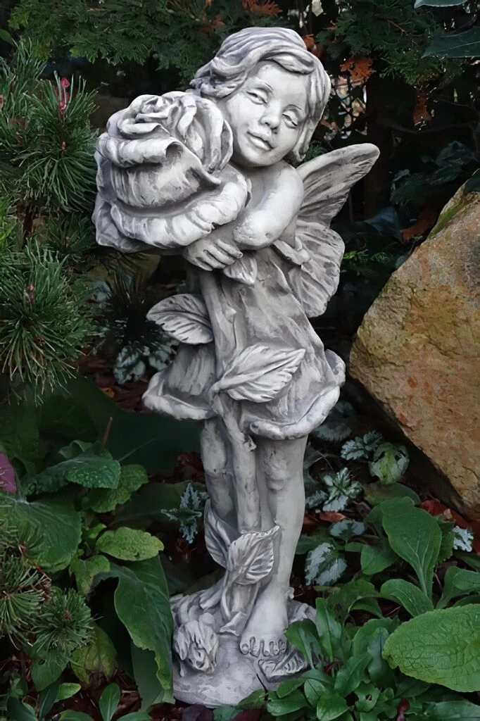 Diese besondere Naturelfe wird mit einer Rosenblüte künstlerisch dargestellt. Egal ob in romantisch oder mystisch angelegten Gärten, die Figur besticht mit einer hohen Langlebigkeit und kann auch im Winter als Dekoration im Außenbereich dienen.
