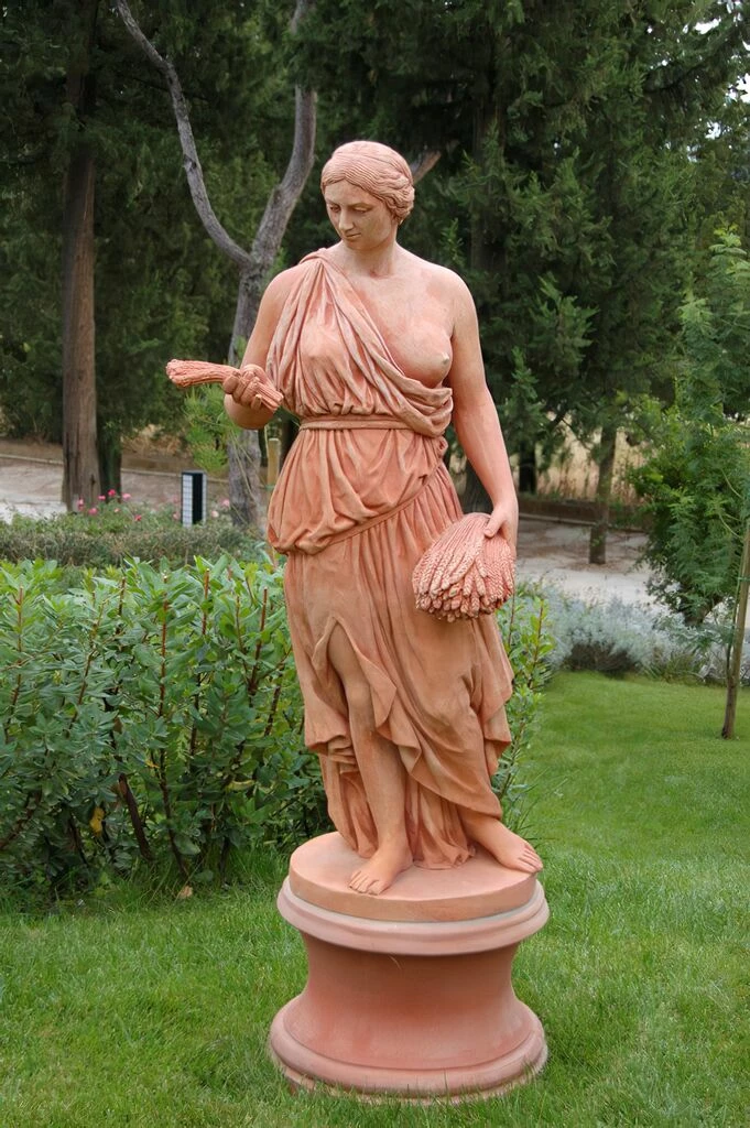 Bereits in der Antike und der Renaissance stellte Terrakotta ein beliebtes, leicht zu bearbeitendes Material dar, um Skulpturen, Vasen und Säulen stilvoll und gleichzeitig robust herzustellen. Für die Verarbeitung wird ein spezielles, eisenhaltiges Tongemisch verwendet, welches den Statuen einen einzigartigen warmen, roten Farbton mit Nuancen verleiht. Für diese Skulptur wird Impruneta-Terracotta verwendet, mit einem besonders hohen Anteil an Kuper-, Eisen- sowie Aluminiumoxiden. Nachdem das Steingut abgebaut und gekocht wurde, wird das Material zu einer Statue geformt, welche in liebevoller Handarbeit eine detailreiche Oberflächenbearbeitung erhält. Nach der Modellierung erfolgt der Brennprozess im traditionellen Holzofen bei 960°C. Die für Terrakotta übliche Brenntemperatur liegt somit bei dieser speziellen Sorte höher. Im Gegensatz zu klassischem Ton erhält dieser Naturstoff keine Glasur am Ende der Bearbeitung. Passend zu der Statue finden Sie bei uns Podeste und Pflanzgefäße aus Terrakotta.