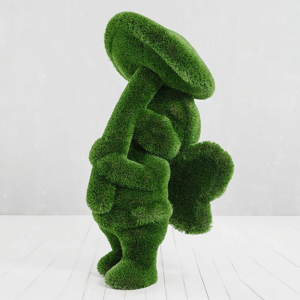 Alle Figuren entstehen als 3D-Modell am Computer. Anschließend wird der Rahmen aus Glasfaserkunststoff hergestellt und von Hand mit Kunstrasen beklebt. Jede Skulptur ist somit ein individuelles Unikat. Dank des Glasfaser Rahmens sind die Topiaries besonders leicht, stoßfest und langlebig – außerdem rostfrei, korrosions- sowie temperatur- und UV-beständig. Es sind keine weiteren Pflegemaßnahmen nötig. Die Gewichtsbeschränkung für die Formschnittfiguren liegt zwischen 30 bis 250kg. Wichtig ist, dass die Skulpturen weit entfernt von Feuerstellen aufgestellt werden.