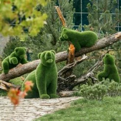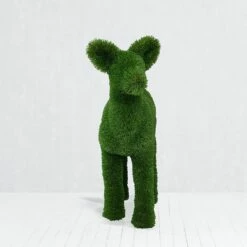 Alle Figuren entstehen als 3D-Modell am Computer. Anschließend wird der Rahmen aus Glasfaserkunststoff hergestellt und von Hand mit Kunstrasen beklebt. Jede Skulptur ist somit ein individuelles Unikat. Dank des Glasfaser Rahmens sind die Topiaries besonders leicht, stoßfest und langlebig – außerdem rostfrei, korrosions- sowie temperatur- und UV-beständig. Es sind keine weiteren Pflegemaßnahmen nötig. Die Gewichtsbeschränkung für die Formschnittfiguren liegt zwischen 30 bis 250kg. Bitte achten Sie darauf, die Skulpturen weit entfernt von Feuerstellen aufzustellen.