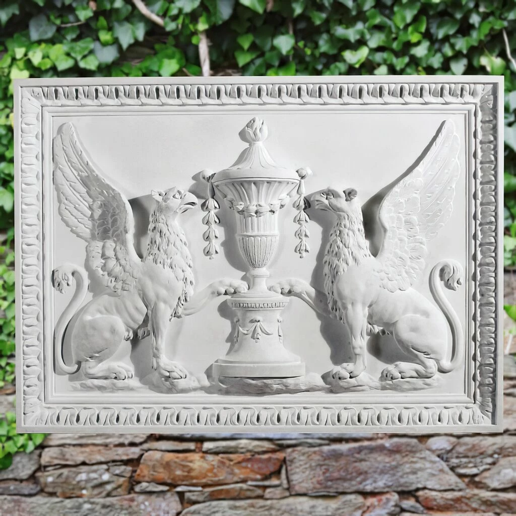 Dieses historische Wandrelief mit Greifen wird in einer traditionsreichen Künstlerwerkstatt aus Steinguss gefertigt. Das kunstvolle Relief kann sowohl im Innen- als auch im Außenbereich gestalterisch platziert werden. Das Greifen Relief ist ein attraktiver Hingucker und wird jeden Standort ausdrucksstark bereichern.