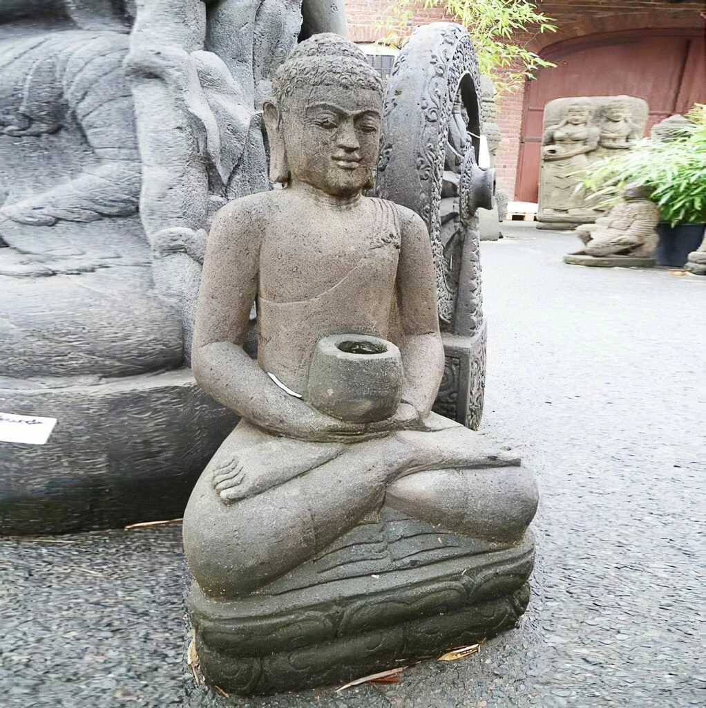 Buddhafiguren symbolisieren die Eintracht zwischen Körper und Geist, sorgen für innere Ruhe und üben eine enorme Schutzfunktion aus. Der hier im Lotussitz dargestellte sitzende Buddha aus Stein hält ein Gefäß in den Händen und strahlt Zufriedenheit und Harmonie aus. Diese Mimik der Gelassenheit und Ruhe soll die innere Haltung Siddharta Gautamas ausdrücken, mit welcher er dem Leid des Lebens begegnete. Eine sitzende Buddhafigur mahnt, belehrt und erleuchtet. Mit einer Buddha Statue aus unserem Onlineshop bringen Sie nicht zuletzt ein Stück fernöstlichen Zaubers in Ihr Heim. Diese handgefertigte und aus dem vollen Stein geschlagene Gartenskulptur eines sitzenden Buddhas ist ein Unikat des indonesischen Künstlers Mukit, die auch Ihren Garten in die inspirierende Atmosphäre fernöstlichen Zaubers tauchen wird.