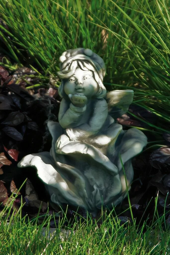Das kleine Wichtel Mädchen aus Steinguss wird handwerklich vom Bildhauer mit einer Rosenblüte gefertigt. Der Stein ist witterungsbeständig und die Figur erhält ein antikgraues Erscheinungsbild. Um den Wichtel auch im Blumenbeet zur Geltung zu bringen, kann er mit einem Stab erhöht aufgestellt werden.